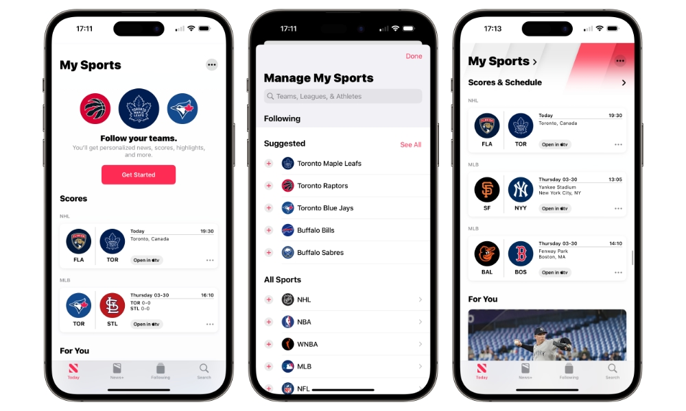 Olahraga Saya di Apple News pertama kali hadir di iOS 16.0 tahun lalu sebagai area khusus bagi penggemar olahraga untuk mendapatkan skor, jadwal, dan berita terbaru untuk tim favorit mereka. Favorit disinkronkan dengan aplikasi TV Apple sehingga Anda dapat mengikuti game terbaru melalui aplikasi atau layanan streaming apa pun yang terintegrasi dengan Apple TV. Misalnya, penggemar MLB akan mendapatkan game Friday Night Baseball melalui Apple TV+ dan tautan ke game lain di aplikasi MLB atau aplikasi penyiaran olahraga yang lebih umum seperti ESPN.