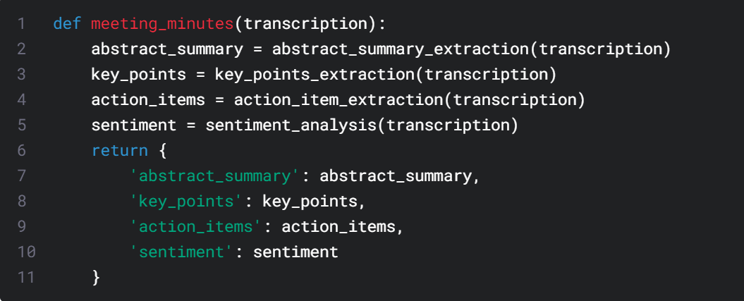 - action_item_extraction untuk mengidentifikasi item tindakan pada transkrip. Nantinya transkrip akan diidentifikasi berdasarkan tugas atau tindakan yang telah dibuat saat rapat berlangsung. Tugas yang bisa diidentifikasi bisa berupa tugas individu atau tugas secara umum yang perlu dilakukan oleh kelompok.
