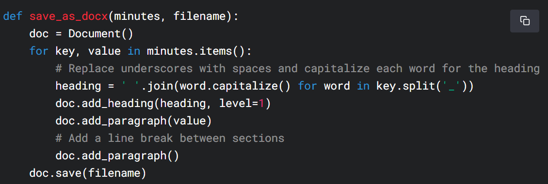 - save_as_docx untuk mengkonversi teks menjadi dokumen word. Nantinya, file yang dihasilkan akan berisi ringkasan abstrak, poin penting, item tindakan, dan analisis hasil rapat. Nama dari file ini bisa disesuaikan dengan kebutuhan pengguna.