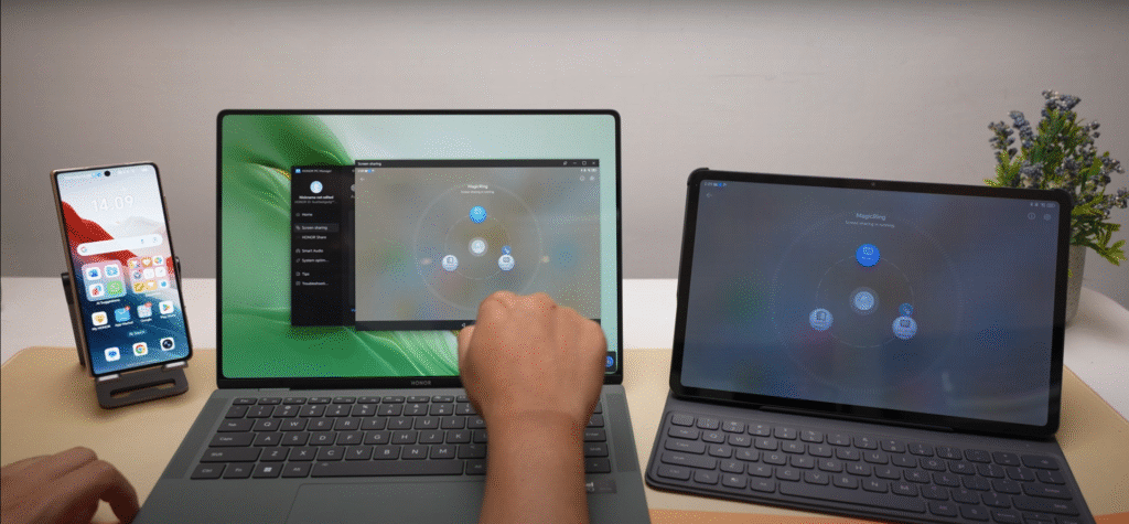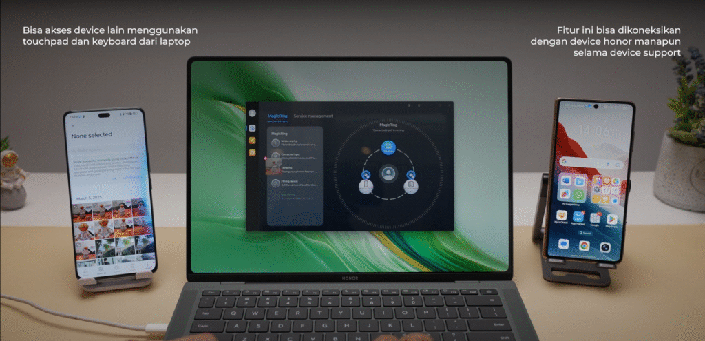 Semua fitur ekosistem HONOR ini terpusat di Magic Ring. Fungsinya mirip kayak Super Device-nya Huawei. Lewat Magic Ring, semua device HONOR bisa saling terhubung dan komunikasi secara seamless. Dari file transfer, screen sharing, sampe kolaborasi antar aplikasi.