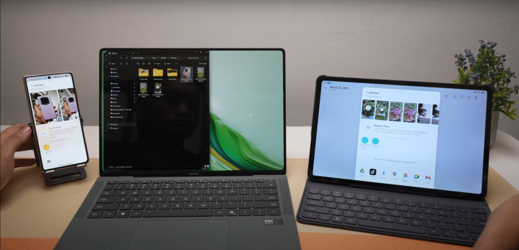 Nah, kalau device kamu ngga support Connected Input kayak HONOR Pad 9, bisa pake screen sharing. Tinggal aktifin lewat Magic Ring, pilih tablet, dan aktifin opsi Transfer to this device. Layar tablet bakal muncul di laptop dan kamu bisa tarik file dari sana.