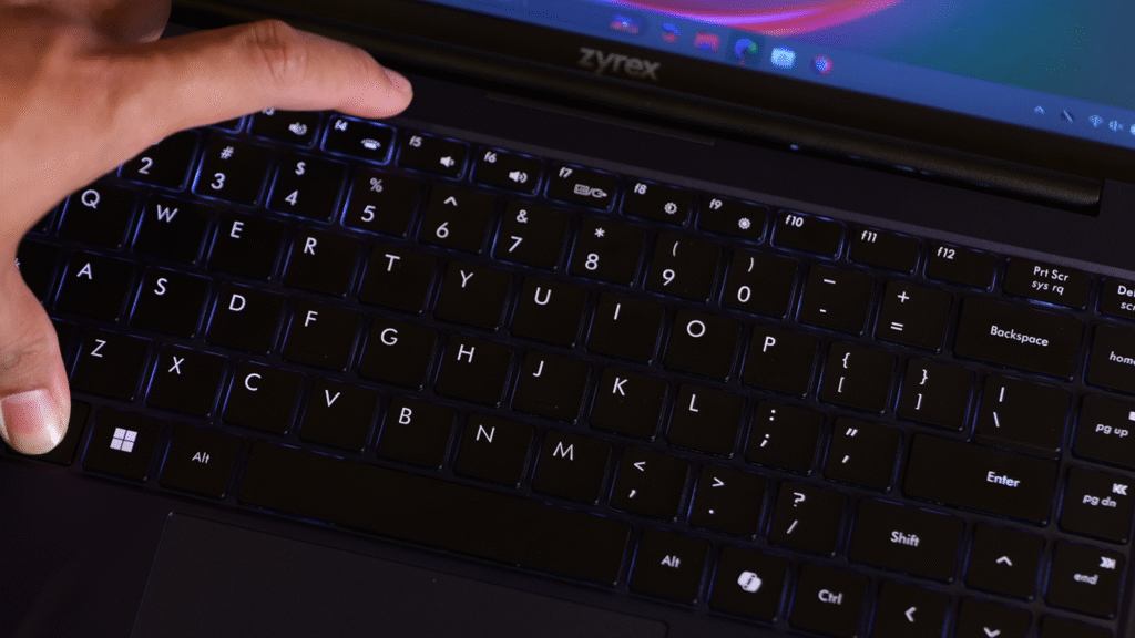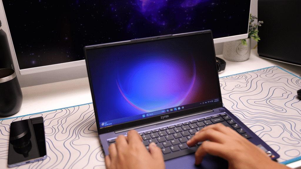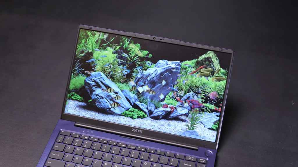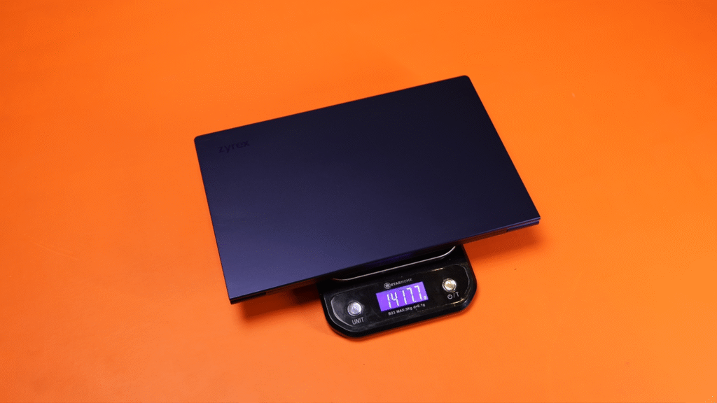 Zyrex D-Tech tampil dengan desain minimalis. Warna biru tua yang netral, tanpa banyak aksen aneh-aneh. Kesan pertamanya mungkin sederhana, tapi justru itu yang bikin laptop ini gampang masuk ke berbagai style pengguna.