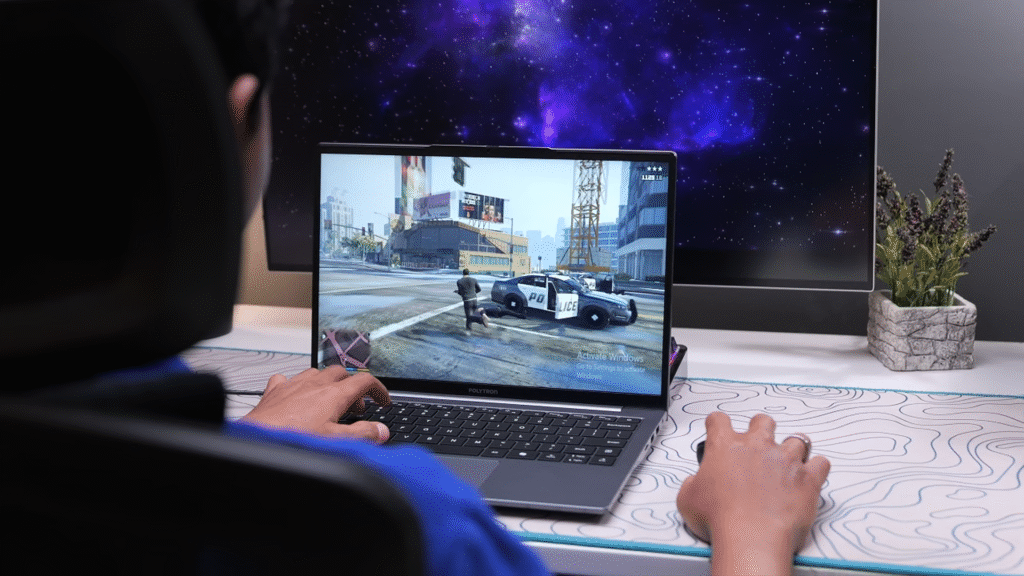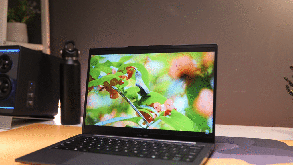 Dilihat dari luar, Luxia i3 nggak berusaha tampil mencolok. Desainnya clean dan vibe-nya minimalis tapi tetap profesional. Bagian belakang layarnya pakai bahan metal, yang bikin kesan premium langsung terasa saat disentuh. Logo Polytron juga ditaruh kecil di sudut, nggak over branding, jadi nggak norak dipakai di kafe atau ruang rapat. Selain itu, layarnya bisa dibuka sampai 180 derajat. dan bisa dibuka pakai satu tangan, sebuah detail kecil yang sering luput, tapi sebenernya penting buat kenyamanan harian.